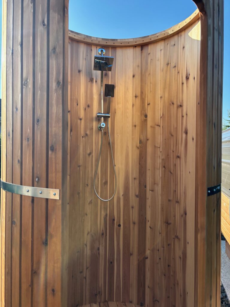 Découvrez la Douche Extérieure en Cèdre Rouge en forme de Baril Vertical de Saunaspa - un mariage exquis de fonctionnalité et d'esthétique qui transforme votre espace extérieur en un oasis luxueux. Fabriquée avec une attention méticuleuse aux détails, cette douche extérieure n'est pas seulement un ajout pratique, mais aussi une pièce maîtresse qui ajoute une touche d'élégance à votre environnement.