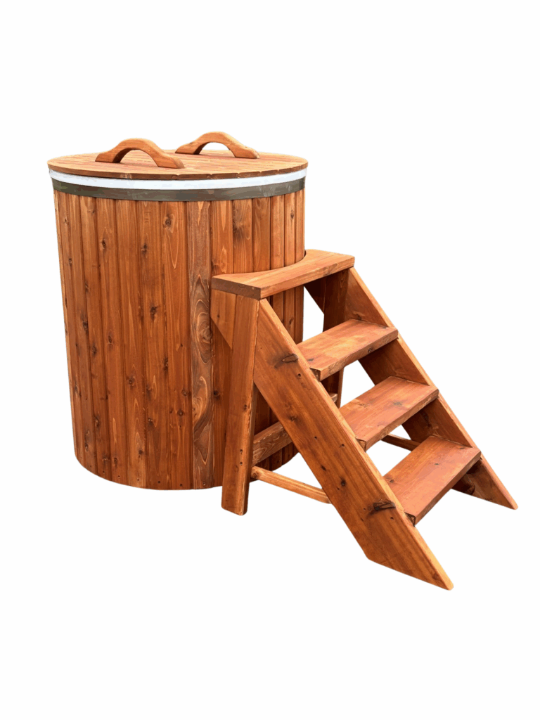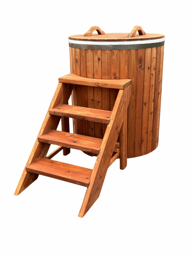Premium red cedar cold plunge measuring 43" tall and 36" wide. Built with a durable plastic liner and an integrated seat for comfort. Compatible with water chillers for continuous cold therapy. Includes matching red cedar steps and a red cedar lid for a complete, elegant setup.